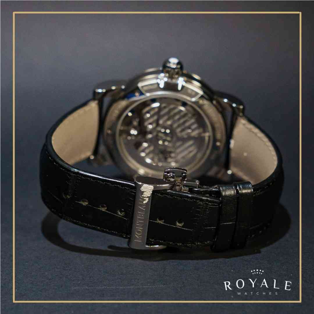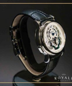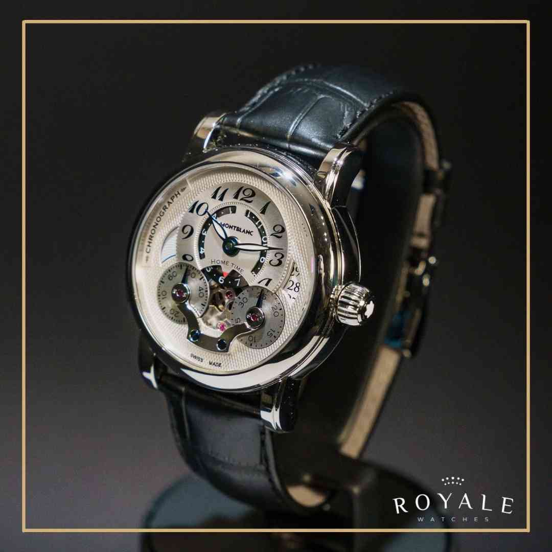 A hora exibida em um grande mostrador fora do centro é um dos charmes da peça que é complementada por uma mão esqueletizada que mostra os minutos. A caixa de 43mm de diâmetro em aço traz uma coroa que estampa a marca Montblanc.